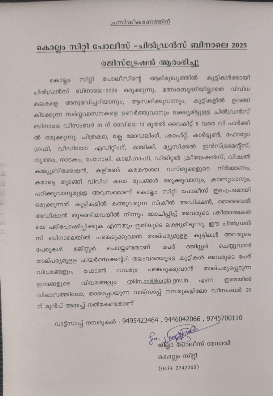 കൊല്ലം സിറ്റി പോലീസ് -ചിൽഡ്രൻസ് ബിനാലെ 2025 രജിസ്ട്രേഷൻ ആരംഭിച്ചു